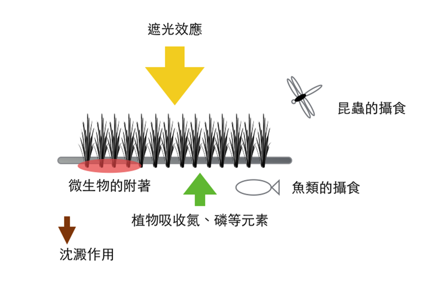 圖三是人工浮島淨化水質的機制圖,浮島的根系是浮體構造,使其底部可以附著微生物和藻類,浮島上的植物吸收氮、磷等元素,有遮光的效應、多樣性生物的攝食作用、整流作用可促進沈澱,以上作用皆能促進水質的淨化。