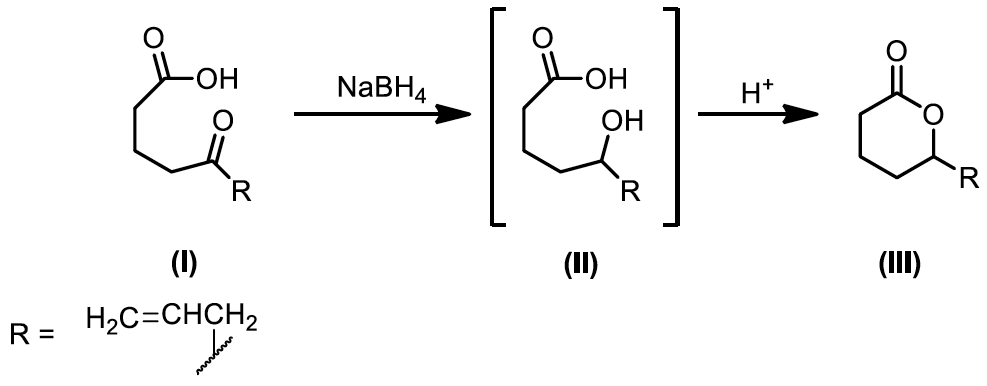 反應機構如圖五所示,帶有羧酸 (carboxylic acid) 官能基的起始物 (I),加入硼氫化鈉 (sodium borohydride, NaBH4) 還原酮 (ketone) 基,得到還原產物 (II),在酸性條件下,經質子轉移 (proton transfer) 以及內酯化作用,可以得到內酯產物 (III)