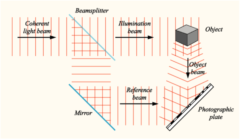 全像片的製作示意圖如圖一,將一束光分為兩道後,一道光經過物體,一道光沒有經過物體,將再次聚集時產生的相位差記錄起來。若兩道光沒有經過物體,則兩道光一定同相,但若是有其中一道光經過物體,該光束就會受到物體的影響而和原先的光線有了不同的相位。因為對於兩道光的同調性要求很高,雷射 (Laser) 正符合單一波長且高度同調的需求,因此大多使用雷射來製作全像片。