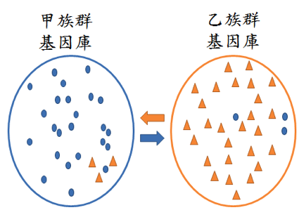 基因交流是指在不同族群間的等位基因有交流的現象,而使基因庫發生變化的現象。例如,某個基因在甲族群中的所有等位基因有 A1、A2、A3 三種,比例是 $$1:1:1$$;同一個基因在乙族群中的所有等位基因僅有 A1、A2 兩種,比例是 $$2:1$$。
