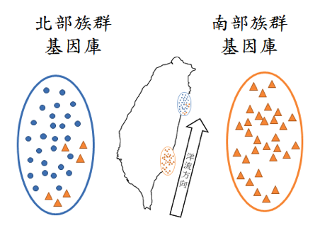 而個體隨洋流漂移,例如臺灣東部的洋流(黑潮)流向一年四季都是從南到北,洋流使海漂植物只能從南部往北部遷移,因此,若排除動物攜帶移動的可能性,北部族群接收南部來的等位基因但是無法傳送等位基因給南部族群,這就是單向的基因交流(圖二)。