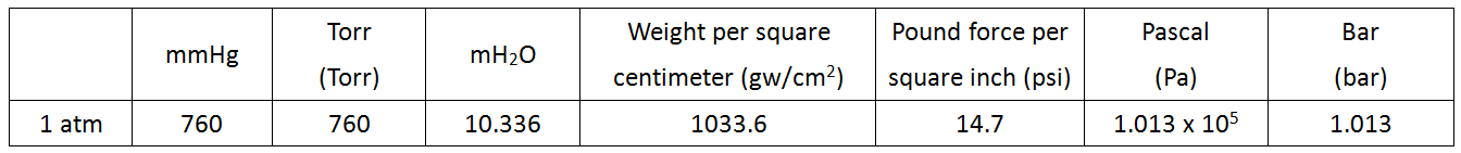 由於不同地方的海拔高度不同,也因此我們需要一個標準大氣壓值為參考標準,國際參考壓力值定義地球海平面上的平均壓力為101325 Pa,也就是1 atm。下表為其他大氣壓力單位和大氣壓的轉換關係。