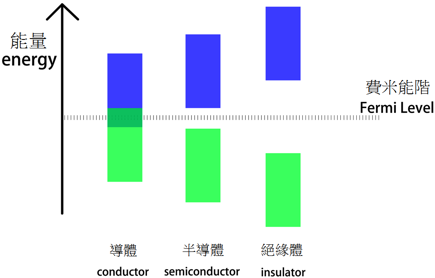 費米能階 (Fermi level) 是金屬在絕對零度 (absolute zero) 時,電子依據遞建原理 (aufbau principle) 從低能量的能階往上填滿,所能填到的最高能階。而在非絕對零度時,電子會因為熱的緣故,而有機會出現在更高的能階裡,這時費米能階會對應到電子遵守費米-狄拉克分佈 (Fermi-Dirac distribution) 時,分佈機率為 50% 的區域。對於金屬而言,導帶和價帶之間有重疊(如圖二,縱軸為能量,上方藍色為導帶,下方綠色為價帶,虛線為費米能階),而費米能階落在導帶內部,也就是導帶此時是部分填有電子的情況,因此金屬具有導電性。