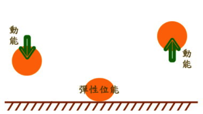 再拿拍皮球的動作當例子,當球落到地面上時,球會受到地面的阻擋而變得較扁,此時球往下衝的動能就轉變為彈性位能儲存(此處不考慮能量以熱的形式散失)。接著,藉由釋放這股彈性位能,球能夠彈離地面,重新獲得動能。(圖一)