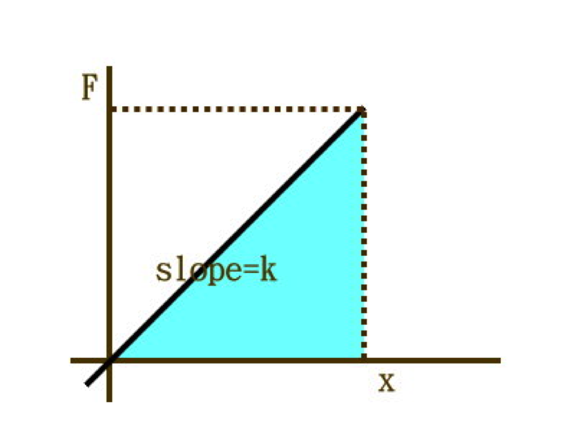 進行積分計算,或是直接計算(圖二)三角形面積,可以得到彈性位能 $$U=0.5kx^2$$。