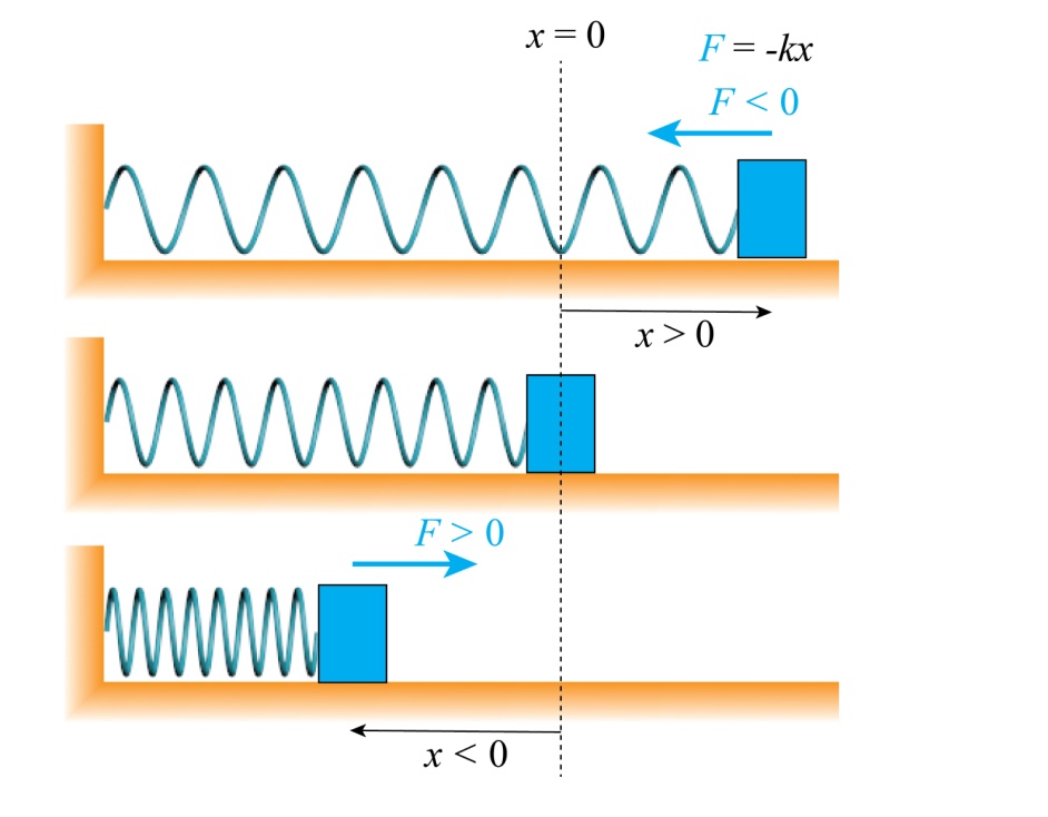 如果你將物體拉長 $$X$$ 距離,則放手以後,它的彈性力的大小,根據著名的虎克定律(Hooke’s Law)會和 $$X$$ 距離成正比,其關係式為 $$F = -kX$$(其中 $$k$$ 為彈性係數,決定於不同性質的材料組成) ,如圖二所示。
