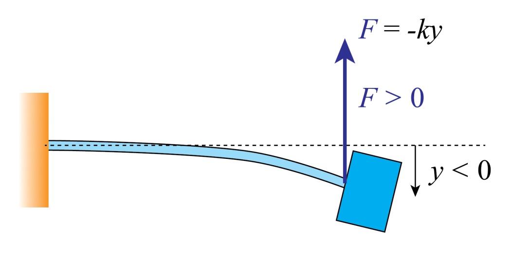 假設有一個狹長的物體,受到來自與長軸垂直方向的外力而變形,我們稱之為彎曲。移除外力後,使物體恢復成原來形狀的恢復力,就是彎力。和前一個例子相同,彎力的大小和物體變形的程度成正比,其關係式我們用 $$F = -kY$$(其中 $$k$$ 為彈性係數,$$Y$$ 代表垂直方向的位移,上例的 $$X$$ 則代表水平方向,以做為區別) ,如圖三所示。