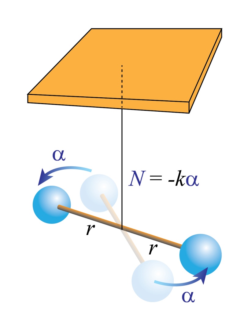 假設有兩個物體,分別在橫軸的兩端,而轉動軸和任一物體的距離為 $$r$$,然後開始轉動該系統。假定我轉了 $$\alpha$$ 角,則最後得到的力矩為 $$N =rF =-k\alpha$$ ($$k$$ 為常數)。你會發現,力矩的大小將會和扭轉的程度大小成正比關係(如圖四所示。)