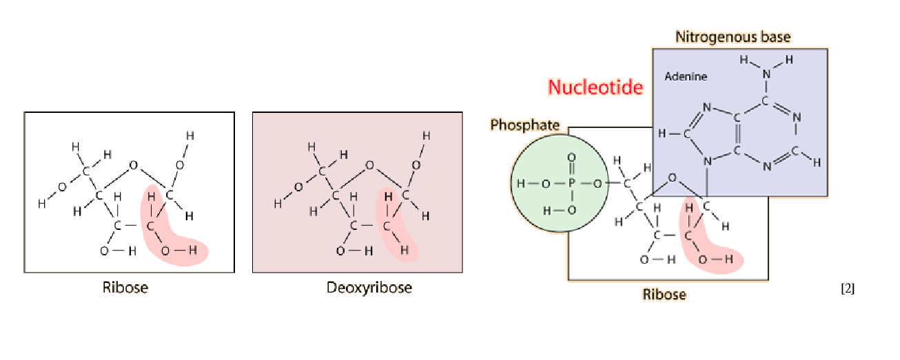 另外,五碳醣與RNA和DNA的構成有關。核醣(Ribose)和脫氧核醣(Deoxyribose),分別是RNA(Ribonucleic acid;核糖核酸)和DNA(Deoxyribonucleic acid;去氧核糖核酸)的主要構成。[1]DNA是絕大部分生物的遺傳物質,為一長線形巨大分子,由許多去氧核糖核甘酸(Deoxyribonucleotide)所聚合而成,其包含了一個含氮鹼基(Nitrogenous base)、一個戊醣以及一個磷酸根(Phosphate group)。含氮鹼基負責攜帶遺傳訊息,而五碳糖和磷酸根則是形成DNA分子的骨架。而DNA與RNA的差別在五碳醣的2號碳上,DNA比RNA少了一個氧原子,因此名為去氧核醣核酸。[2]參考文獻:
