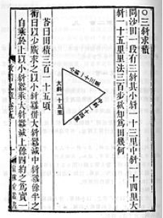 《數書九章》卷五題二云:「以小斜冪并大斜冪,減中斜冪,餘半之,同乘於上。以小斜冪并大斜冪,減上,餘四約之為實,開平方,得積。」