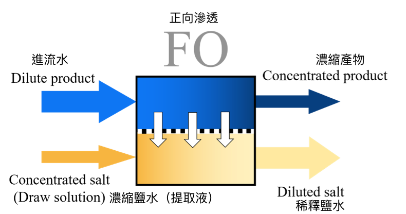 正向滲透 (FO) 為不須施加而外壓力就可以進行的自然程序,透過半透膜兩側溶質濃度的不同,使水分子從進流側滲透過半透膜到達滲透側,進而造成進流水濃縮、滲透側提取液稀釋的結果,最後再經由提取液回收方式,把水分子分離出來,得到純水並同時將提取液濃縮再使用。