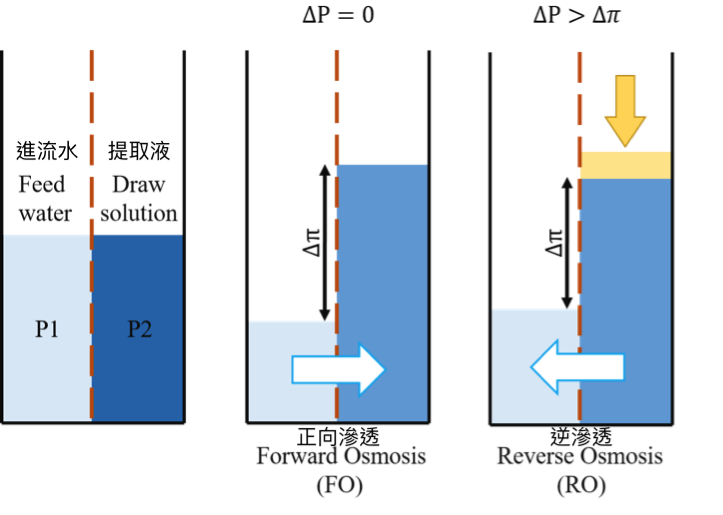 滲透是早已被人們熟知且廣泛利用的物理現象,其可以定義為經由滲透壓差的驅動,使水通過一個選擇性半透膜的淨移動作用,而半滲透膜顧名思義,能夠在排除其他溶質分子與離子的同時讓水通過。如今許多領域,像是水處理、食品加工、發電甚至控制藥物釋放都能夠利用滲透現象來達到,而日常生活中最常見例子的就是逆滲透 (Reverse osmosis, RO) 淨化水質,對進流水施以額外的水壓,使水分子由滲透壓高傳輸至薄膜滲透壓低的另一側生成純水的方法;相反地,正向滲透 (Forward osmosis, FO) 即直接利用溶液相對之滲透壓(由低至高)來驅動水的傳輸,使進流水濃縮、稀釋高濃度的提取液 (Draw solution)。