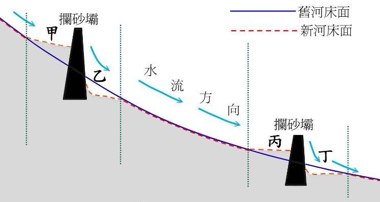 興建欄砂壩之後,在壩體的上游處,因為砂石堆積,造成河床坡度減緩、流速變慢(圖一中甲、丙處);在壩體的下游處,則造成河床坡度落差變大,在豐水期間, 流水的加速沖刷,使得河床受到強烈的侵蝕(圖一中乙、丁處),河谷兩側山坡坡腳長期受到挖蝕,會造成邊坡不穩,而發生崩塌。另外,像是大漢溪河道上的三個 大型攔砂壩中的巴陵壩,於民國96年9月發生潰壩,更是直接威脅到中、下游地區居民的生命財產安全。
