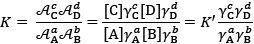 其中K為熱力學當中的理想狀態的反應平衡常數。根據熱力學對於反應平衡常數、吉布斯自由能(Gibbs free energy)的描述,K在定溫下應為一定值。K’則為「真實」的反應平衡常數,相當於濃度的乘積;由於活性係數會受到各因素而改變,因此不一定為一個定值。但當濃度範圍不至於差異太大的情況下,活性係數的變化不大,因此可以將其視為一定值,此時K’則同時可視為一定值。在一般較初階的計算當中,會忽略掉活性係數的影響,此時假設活性係數均為1(即所有的分子均被算入有效濃度),此時K = K’。