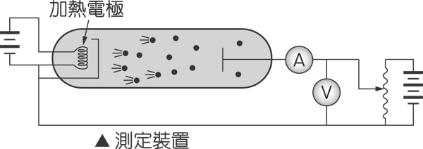 游離能的測定可在陰極射線管中裝入少量氣態元素,外加電壓可測得電流的強度,逐漸增加電壓開始時,電流強度並沒有明顯變化;若電壓持續增加至某一定值時,電流強度急速增加,此一定值稱為游離電位,其所相當之能量稱為游離能。其原理是氣態原子的電子受到某一定值的能量 ( 由電壓控制 ) 的撞擊,使最外層的電子離開原子而飛到陽極,增加兩極間電子數,因而可測得電流強度的增加。[1][3]