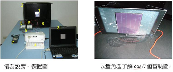 了解光源照射角度的cosθ對太陽電池之電壓、電流之影響。(二)儀器設備
