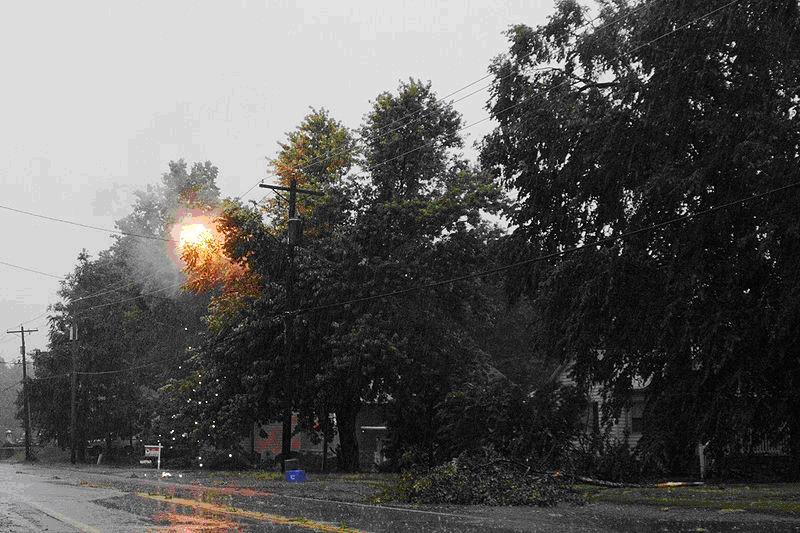 上圖是暴風雪時,電線因為短路而造成爆炸。 短路通常會造成保險絲燒毀或斷路器變成斷路,或其他過載保護,使電路中斷,以避免過多的電流損壞電器,例如:常見家電用品的乾衣機承載電流約10 到20 安培,因此通常使用20 到30 安培的斷路器,而電燈承載電流小於10 安培,因此常常使用15到20 安培的斷路器。在家庭電路中,必須慎選斷路器,以確保電器不被過電流所損壞。