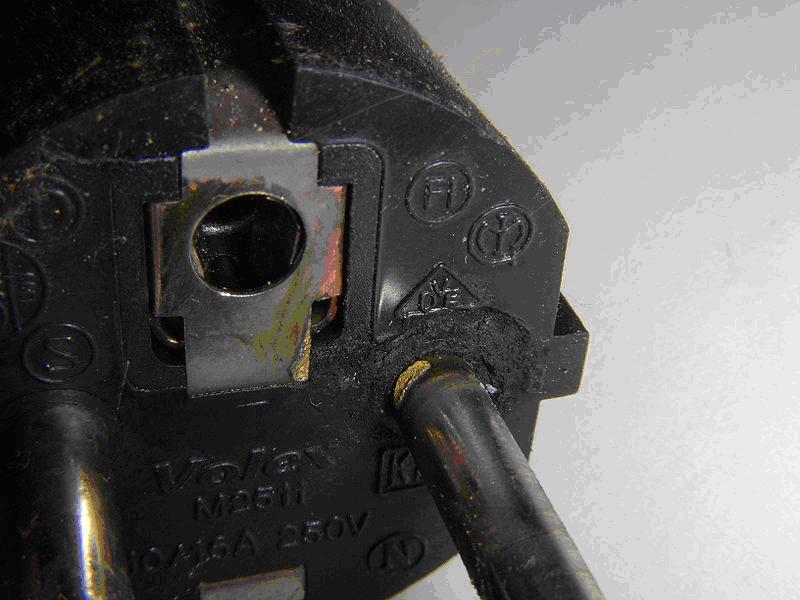圖為一個交流220伏特插頭因為短路而損壞的情形,使一個25安培的斷路器立刻斷路。