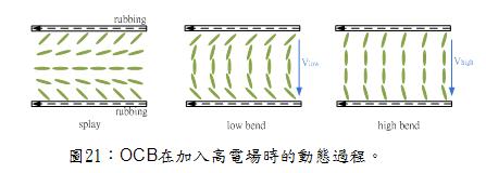 國立彰化師範大學光電所賴柏仲碩士生/國立彰化師範大學物理學系洪連輝教授責任編輯光學補償雙折射(Optically Compensated Birefringence)液晶盒,簡稱OCB cell,此模式是上下基板採用水平配向的結構,當預傾角不大時,液晶分子會趨向自由能較低的Splay態排列。如果所加的電壓超過臨界電壓, 液晶分子就會逐漸從Splay態轉變到Bend態,其動態過程可以細分為: Splay -> Low Bend -> High Bend。