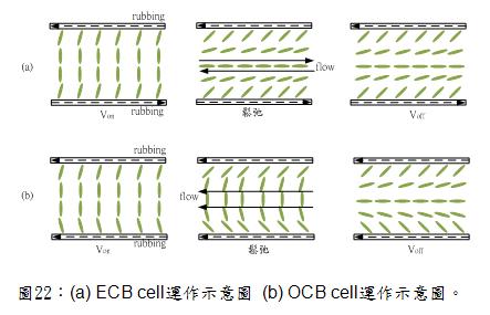 在一般上下基板rubbing反向之水平配向液晶盒中,當取消外加電壓時,兩側接近基板之液晶層有很高之彈性能,因此在外加電壓取消的階段因液晶之強烈扭轉造成上下反轉流動。此間接引起了液晶流速之梯度,造成中間層的液晶產生從垂直轉回水平時,在液晶盒中間產生反向的力矩,如圖22(a),我們稱之為雙折射率控制效應(Electrically Controlled Birefingence)液晶盒,簡稱ECB cell。但OCB cell並無反轉流動,原因是OCB cell的中間液晶層並沒有反向力矩,如圖22(b)所示,因此OCB cell 具有非常快的反應時間。