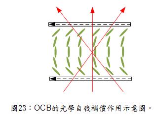 OCB cell除了擁有快速的響應時間,還具有自我補償作用及大視角的特點。如圖23所示,當光線垂直入射時,光通過液晶層,二互相正交的偏振入射光可感受到光學異向性 ;而光往左傾斜入射時,光會先通過下層液晶的部份,由於液晶為單光軸晶體,因此光會垂直液晶分子的長軸射入,長軸與短軸有不同的折射率,故二互相正交的偏振入射光可感受到較大光學異向性(Δn2>Δn0);而通過上層時,光的異向性較小(Δn1<Δn0),因此光通過液晶層時,上下兩層的液晶會有互補效果,所以OCB cell具有自我補償的作用。同理,當光向右傾斜入射時,通過下層時,則光的異向性小,通過上層,則光的異向性大,其所通過的液晶層和向左入射的結構相同,因此OCB cell具有對稱性。