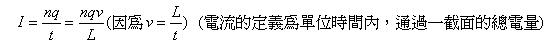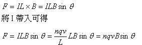 先我們討論帶電粒子在磁場中的受力情形。假設有一個長L的導體,導體內部有n個帶有電量q的正電荷,若這些正電荷以速度v流過長L的導體,並花了時間t,我們可以知道,此時導體上的電流I為:
