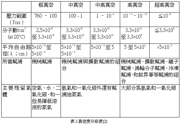 隨壓力的不同,真空可約略分為表2所列。