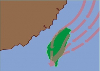 圖一 東北季風氣流越過中央山脈南側 資料來源:洪秀雄(2010)。劇烈天氣現象-落山風。2011年5月16日,取自http://www.lib.ncu.edu.tw/~hong/atmhmpg/sevr/twntopo.htm