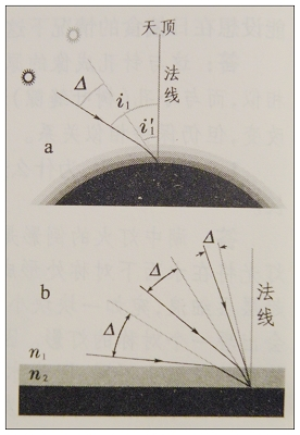 我們可以把地球表面上的大氣看作是由折射率不同的許多水平氣層組成的,越接近地表越稠密,折射率也越大,星光從一個氣層進入下一個氣層時,要折向法線方向。