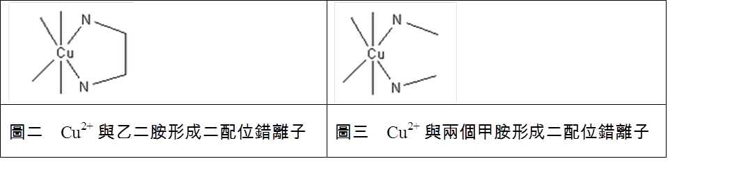 表一 螯合基乙胺與單牙基甲胺形成錯離子的實驗數據