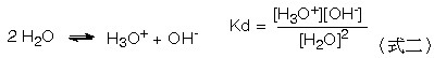 由於水的濃度為常數,故Kd可改寫為 Kw 為式三: