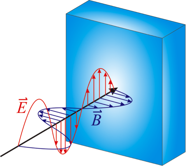 電磁波在傳遞時,電場和磁場都垂直於傳遞方向,如圖一所示。當電磁波遇到物質內的帶電粒子時,電場會驅動正電荷向上移動,而正電荷一旦有了速度,就會受到磁力 \(\vec{F}=q\vec{v}\times \vec{B}\) 而使電荷向物質的方向移動,所以對物質內部產生壓力。