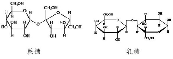 蔗糖 乳糖 (圖片來源: 蔗糖http://en.wikipedia.org/wiki/Sucrose 乳糖http://www.ccscy.chem.ccu.edu.tw/~cyhung/Web-highschool/Chapter-9/Chapter-9.htm)