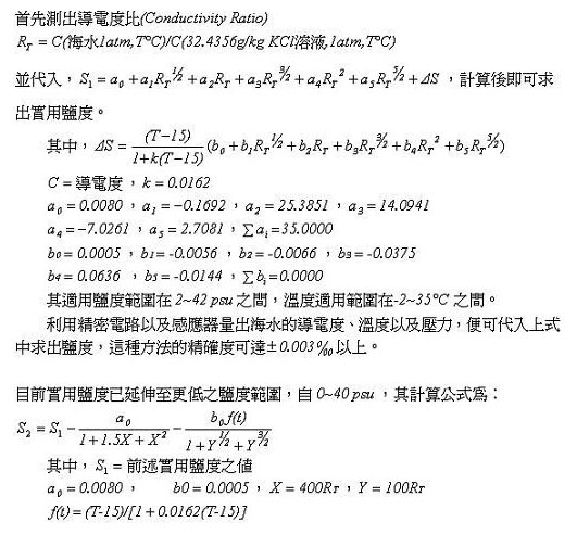 現今則是利用海水之導電度去計算出實用鹽度 (方法如下)。