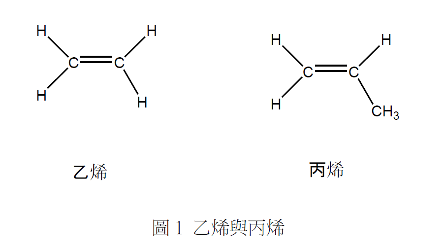 對碳數很少的烯類而言,其名稱是把碳數相同之烷類名稱中之「烷」改為「烯」。例如圖1中之乙烯及丙烯。