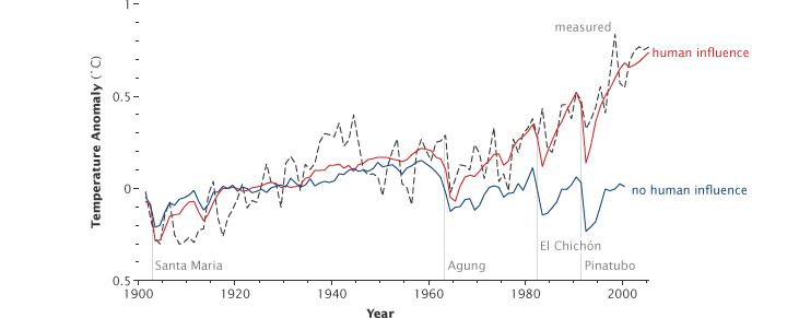 第二個科學家認為近代地球升溫的原因不是因為自然界的因素之證據是,科學家針對過去百年來可以影響地球溫度的所有因素所進行的觀測,例如:太陽光度的變化(黑子數目)、主要火山的噴發、聖嬰-南方振盪(El Nino-Southern Oscillation, ENSO)的循環變化和太平洋年代際震盪(Pacific Decadal Oscillation, PDO)等等,這些觀測所得都無法解釋地球的快速升溫。