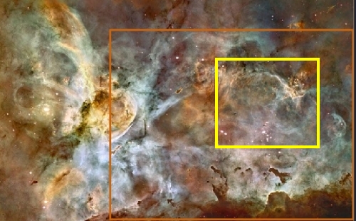 船底座星雲位於船底座,距離地球約7500光年遠。由於許多恆星在此誕生和死亡,使得星雲形狀極為狂亂。船底座星雲有許多質量巨大的恆星,這些恆星的質量甚至是太陽的100倍以上,以致其發出強烈的光芒將周圍的氣體都加熱而發光,下圖為中間偏左區塊放大後,黃色的圓圈為大質量恆星