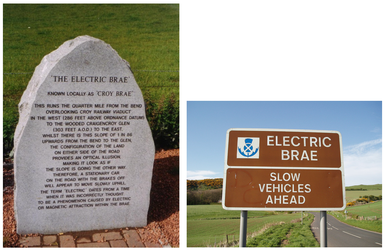 英國蘇格蘭的艾爾郡(Ayrshire)有個名為Electric Brae(電動斜坡)的斜坡,車輛在斜坡上會自動地、緩緩地向斜坡頂端移動,彷彿是搭乘電扶梯一般而獲得 Electric Brae的稱號,為此,當地特別在下坡方向設置警告標示「Slow Vehicles Ahead」,提醒下坡車當心前方車輛可能因為斜坡上神奇的拉力作用而減速(見圖二)。