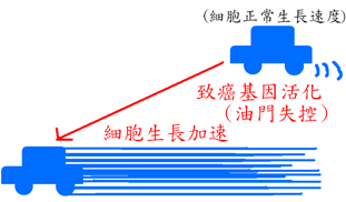 圖一、致癌基因譬喻卡通示意圖。原致癌基因維持細胞正常生長,當原致癌基因活化成為「致癌基因」,細胞生長將不受控制,最後導致癌症的發生。把細胞想像成一台車子,油門能控制車速多快,原致癌基因就像車子中的油門一樣,原致癌基因能決定細胞的生長與分化的速度,而致癌基因就像是被踩到底凹陷壞掉了的油門一樣,讓細胞的生長與分化失去控制。(黃培綺繪製)。