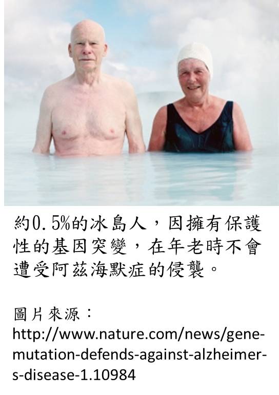 雖然人老之後容易得阿茲海默症,但為什麼仍有許多老人完全沒有失智的困擾?會不會這些人帶著一些未知但會保護神經老化的基因?為了回答這個問題,冰島的科學家首先分析了1,795位冰島居民完整的基因組序列和就醫記錄,結果發現千分之五的冰島人身上APP基因第673個胺基酸會從alanine突變成threonine。接下來再用400,000名北歐人的檢體作全面的檢測,發現帶了這個APP基因突變的人與一般人相比,有5倍的機會活到85歲而沒有罹患阿茲海默症。