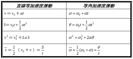 在等角加速度運動公式的推導中,我們發現結果與一維等加速度運動有相似的對應:
