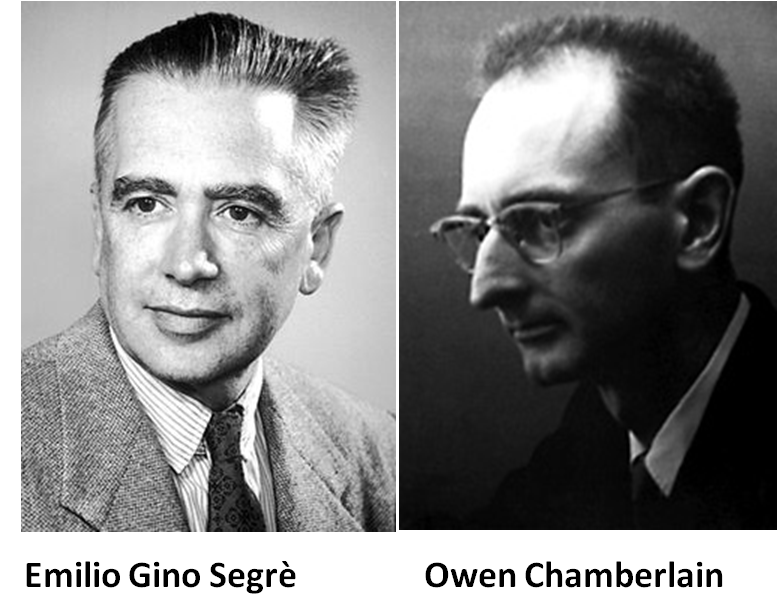 1955年,反質子的存在首度由加州大學柏克萊分校的物理學家塞格雷(Emilio Gino Segrè)和張伯倫(Owen Chamberlain)所証實。(圖片來源:http://www.nobelprize.org/nobel_prizes/physics/laureates/1959/index.html)