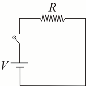 法拉第定律說明,如果電流改變,電感器就會產生感應電動勢 \(\epsilon=-d\Phi/dt\),這樣的電動勢就像一個虛擬電池,存在線圈內部,試圖阻止電流和磁通量的改變。以下是一個簡單的例子:如圖一(a),假設一個迴路中只有一個直流電池 \(V\)、一個電阻器 \(R\) 和一個開關,在開關接通之前,通過整個迴路的電流很明顯是零;而當開關接通之後,由歐姆定律知,電池會馬上送出一個大小為 \(V/R\) 的電流,流過電阻器之後,順著電路流回至電池本身。