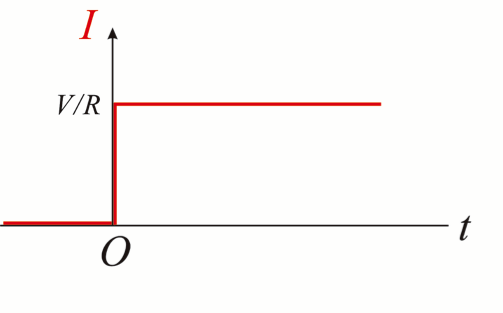 所以,如果我們畫出電流 \(I\) 與時間 \(t\) 的關係圖,將會是圖一(b) 的樣子,其中 \(t=0\) 是開關接通的時刻。注意電流在 \(t=0\) 時,是直接從 \(0\) 跳至 \(V/R\)。