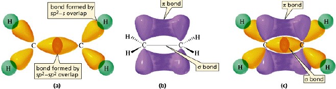 鍵由碳上不參與混成的p軌域形成;(c)乙烯的鍵結。http://www.chem1.com/acad/webtext/chembond/cb07.html