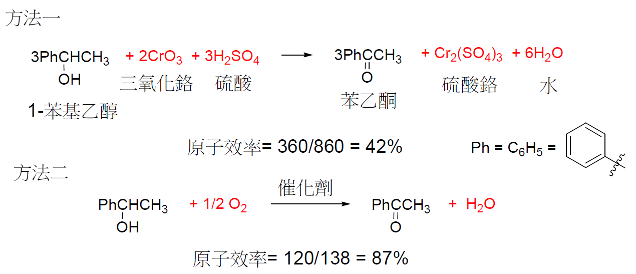 防範勝於治療,這個原則就是在設計化學製程的時候,或是有選擇的時候,要避免產生廢棄物,或採用產生最少廢棄物的方法。化學反應的產物,除了製造的標的物質之外,也常會有隨伴的副產物產生,如果副產物沒有利用價值,就成為廢棄物,也就產生後續處理廢棄物的問題。以圖1為例,讓我們來比較一個簡單的氧化反應:將1-苯基乙醇氧化成為苯乙酮。方法一運用具有毒性的鉻金屬化合物為氧化劑,此法需要用當量級的試劑,也就是說,要氧化三莫耳的1-苯基乙醇,需要用到兩莫耳的三氧化鉻,而且還需要用掉三莫耳的硫酸,除此之外產生了一莫耳的硫酸鉻,和六莫耳的水。當然水不被視為廢棄物,但是硫酸鉻是具有毒性的重金屬之鹽類化合物,不可隨意丟棄,增加了處理的費用。與方法二相比,用空氣裡的氧氣為試劑,藉著少量催化劑的幫助,亦可達到同樣的目的,但是沒有其它的廢棄物,二者的優劣非常明確。