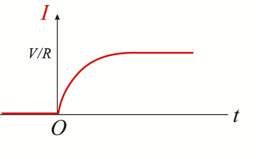 所以,如果我們畫出電流 \(I\) 與時間 \(t\) 的關係圖,將會是圖一(b) 的樣子,其中 \(t=0\) 是開關接通的時刻。注意電流在 \(t=0\) 時,是直接從 \(0\) 跳至 \(V/R\)。