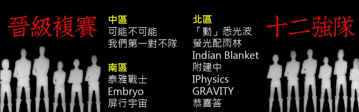經過了長達一個禮拜的馬拉松式賽程以後,今年度的分區複賽名單終於出爐!在此恭喜這十二隊表現優異的同學們!記得參考8/24-8/25的複賽暨工作坊辦法