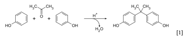 雙酚A(Bisphenol A, BPA或4,4′-dihydroxydiphenyldimethylmethane),又稱二酚基丙烷,它可以由苯酚和丙酮在酸性中合成,如反應式[1]所示。雙酚A分子的結構式如反應式[1]的產物所示。