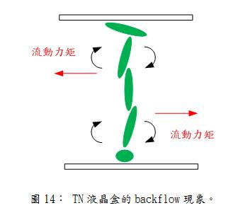 在液晶盒外加電壓或是取消電壓時,往往會造成液晶分子的形變能急遽的變化,而這些變化可能使液晶分子受到臨界液晶分子急遽轉動所造成的流動力矩的影響,導致液晶分子過度轉動而造成瞬間的反轉,而形成反轉流動的現象,由與液晶分子轉動對其雙折射性質有很大關連性的,因此便會產生所謂的光學反躍(optical bounce)現象。以圖14的TN液晶盒為例,其在當外加在液晶盒的電場迅速取消時,由於上下邊界液晶分子的形變能釋放,造成在上下邊界附近的液晶導軸快速旋轉。